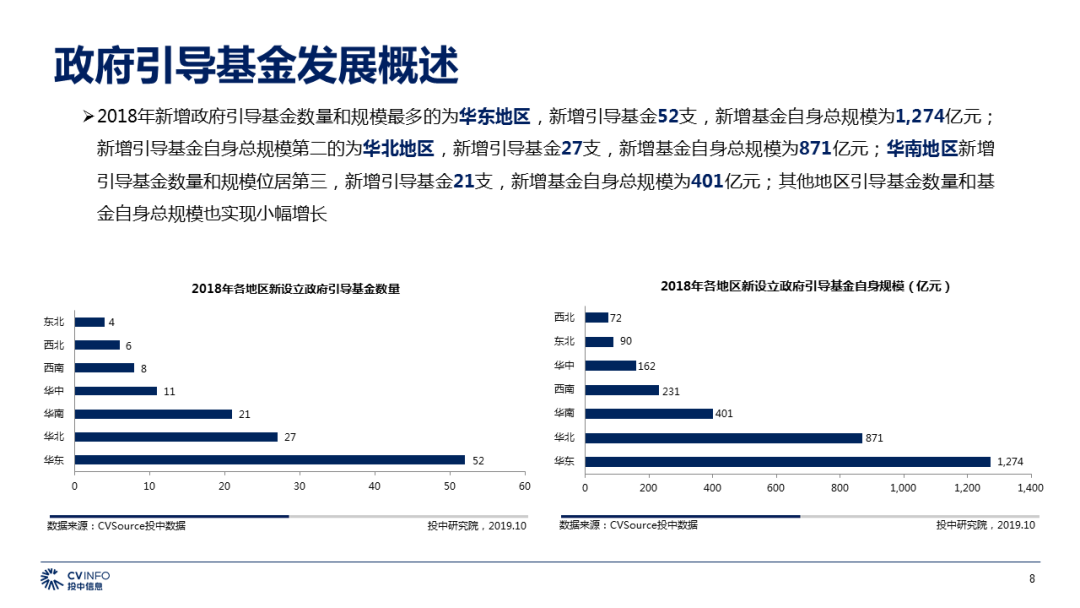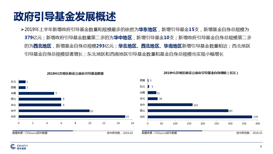 地域:从地域分布来看,截至2019年6月底华东地区累计成立581支政府引导基金,基金自身总规模达7,106亿元,数量和规模均居全国首位。2018年新增政府引导基金数量和规模最多的为华东地区,新增引导基金52支,新增基金自身总规模为1,274亿元
