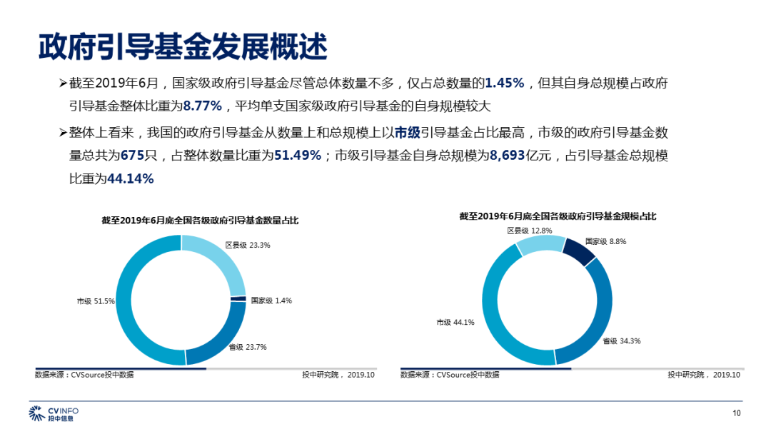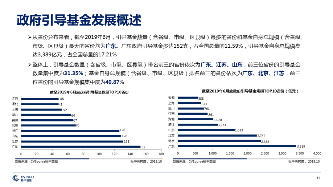 省份:截至2019年6月底,引导基金数量(含省级、市级、区县级)最多的省份和基金自身总规模最大的省份均为广东。广东政府引导基金多达152支,占全国总量的11.59%,引导基金自身总规模高达3,389亿元,占全国总量的17.21%